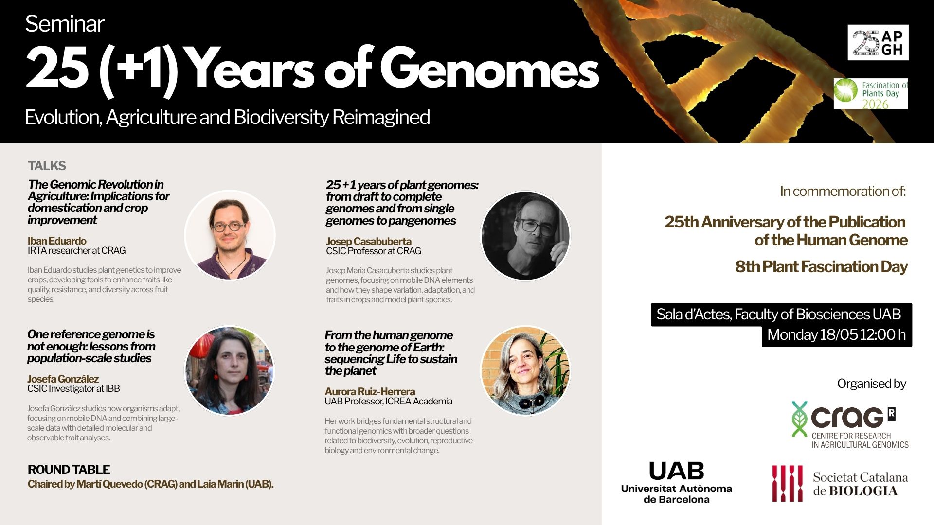 Speakers: Josep Casacuberta (CRAG – CSIC), Iban Eduardo (CRAG – IRTA), Aurora Ruiz-Herrera (UAB – ICREA), Josefa Gonzalez (IBB – CSIC)
