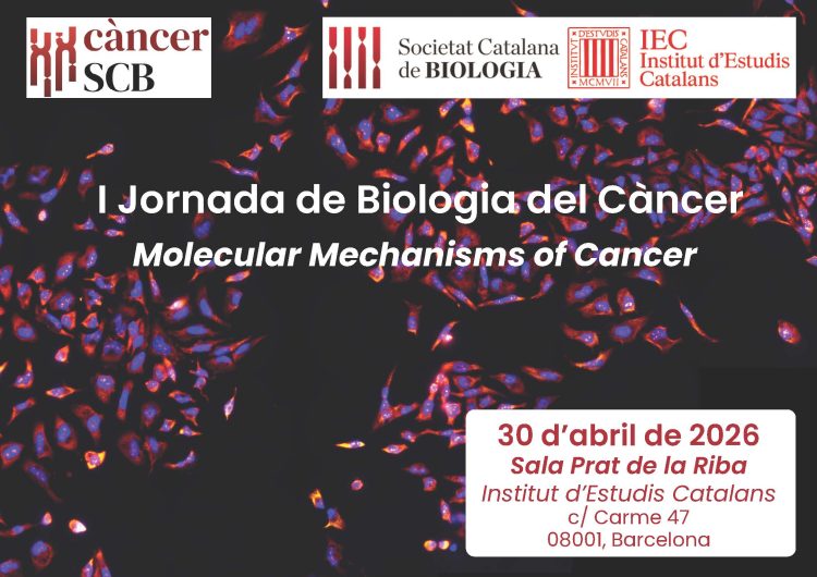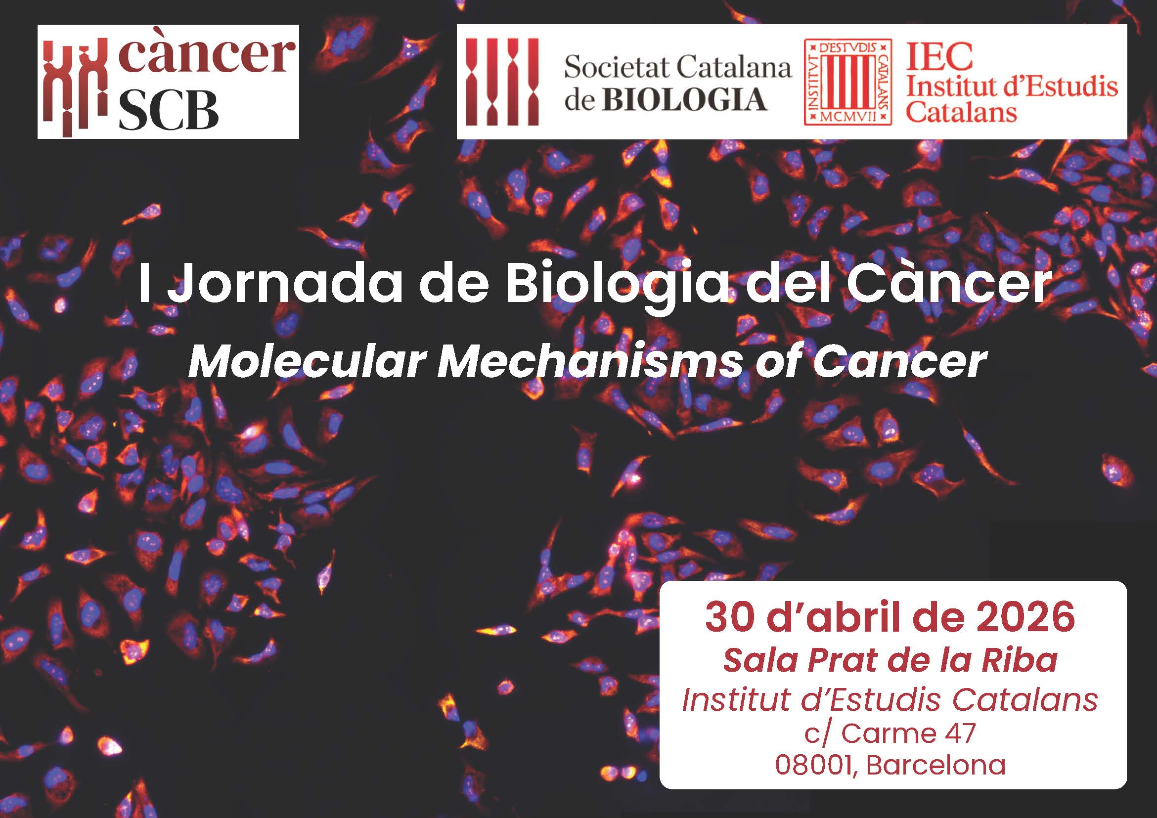 Agenda d'activitatsGeneralSLIDEHOME I Jornada de Biologia del Càncer SCB 2026-04-30 30 abr. 2026 SCB 0 0 Molecular Mechanisms of Cancer Data: 30 d’abril de 2026 Lloc: Sala Prat de la Riba, Institut d’Estudis Catalans Organitza: Secció de Biologia del Càncer de la SCB Inscripcions (s’obriran properament) Programa Pòster